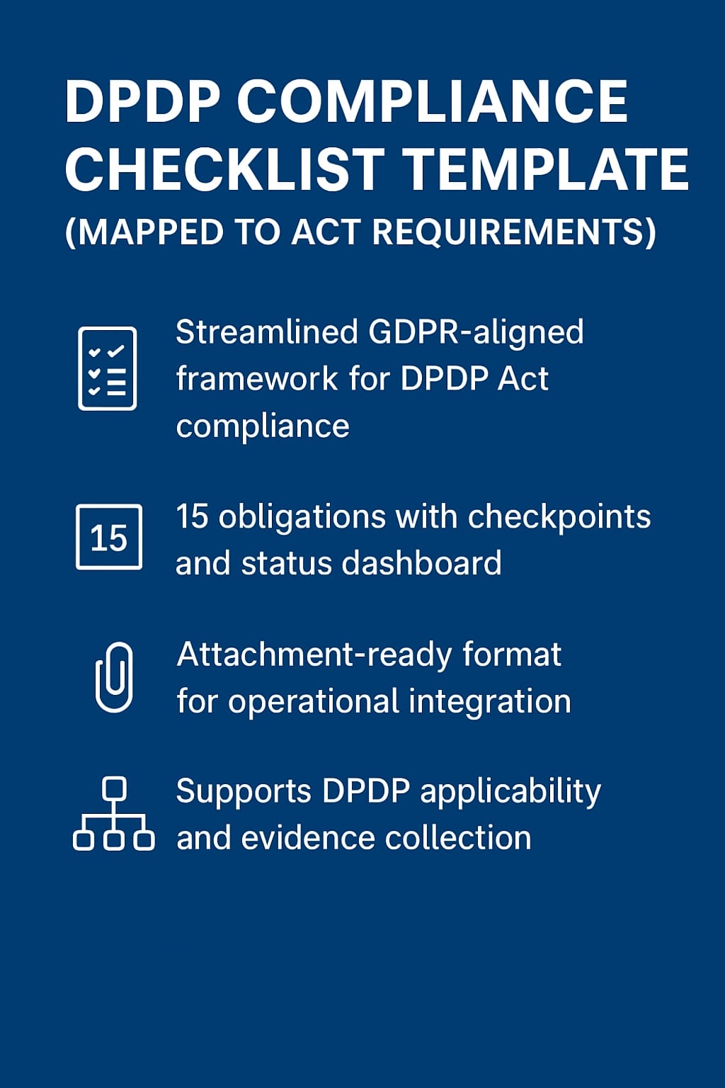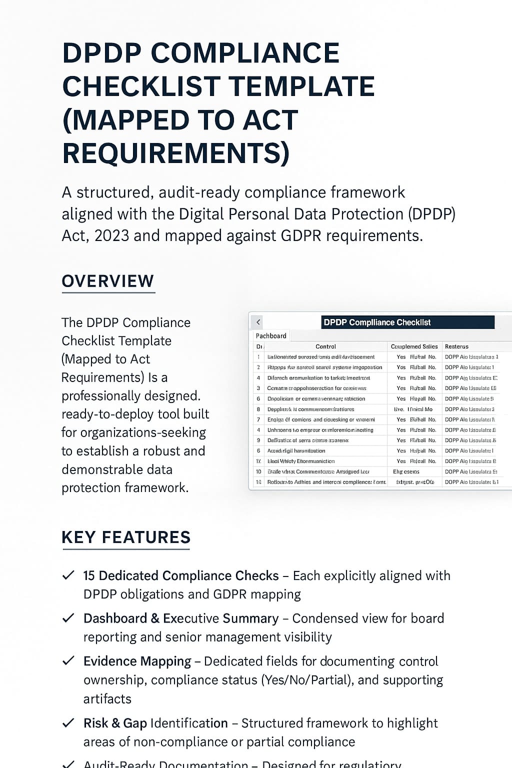 The DPDP Compliance Checklist Template (Mapped to Act Requirements) is a professionally designed, audit-ready Excel tool built to help organizations comply with the Digital Personal Data Protection (DPDP) Act, 2023 and align with GDPR standards.